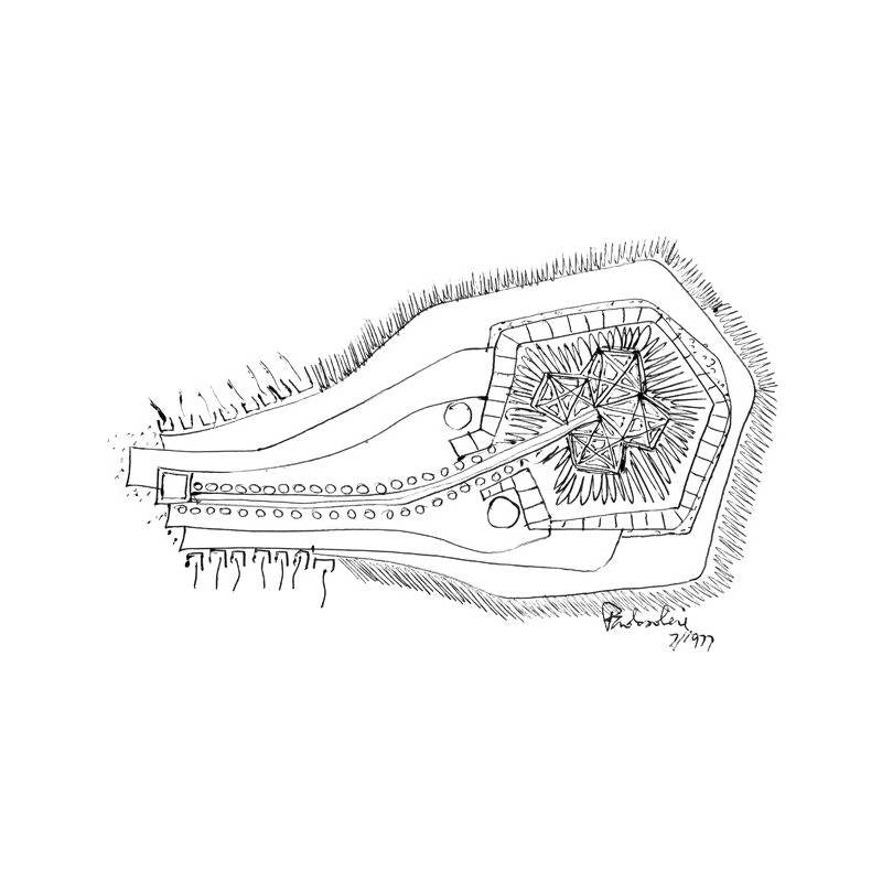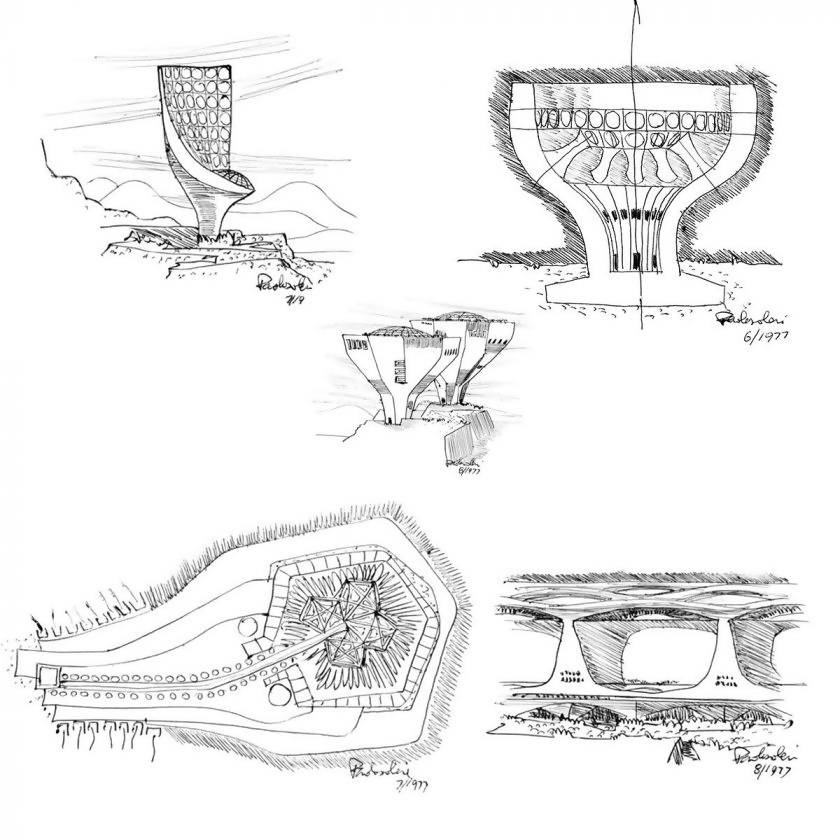 Many of Soleri’s earlier urban structures were shaped plant-like, rooted in the ground. Thier upward growth optimizes the maximum exposure to the sun. As if the leaves absorbing the light and collecting the rain to reclaim the dispersed energy in the natural cycle.