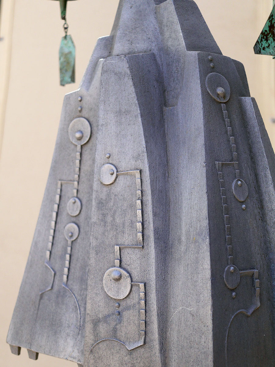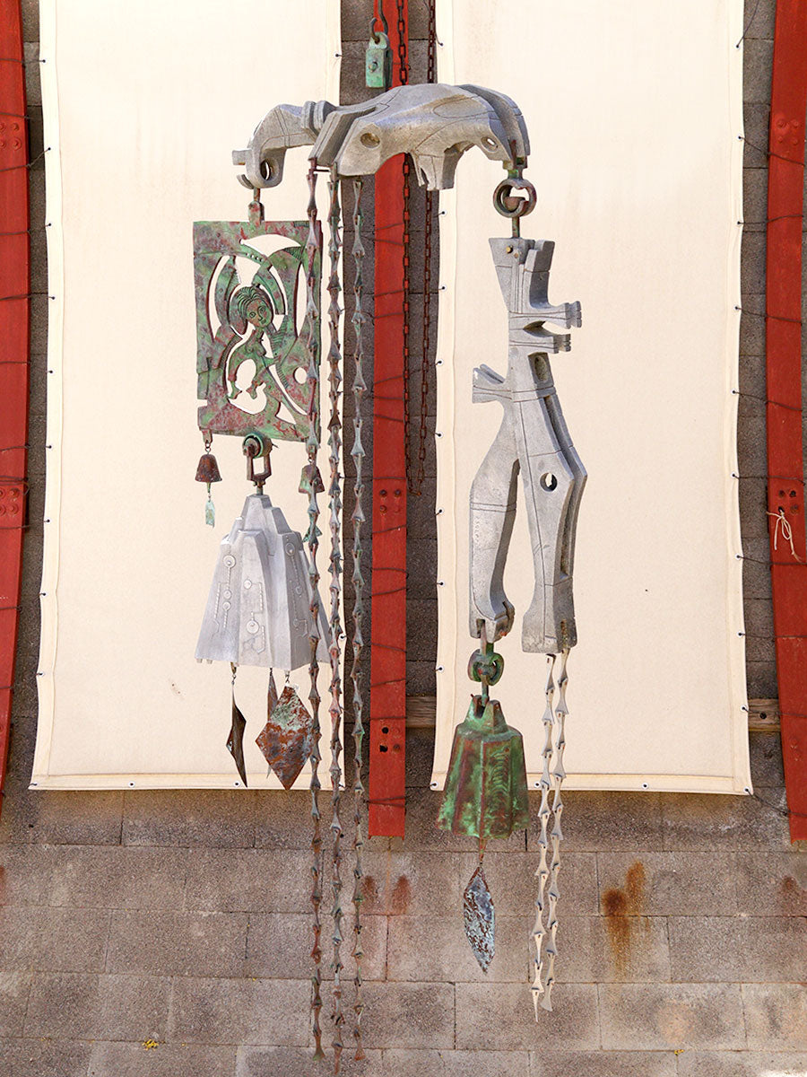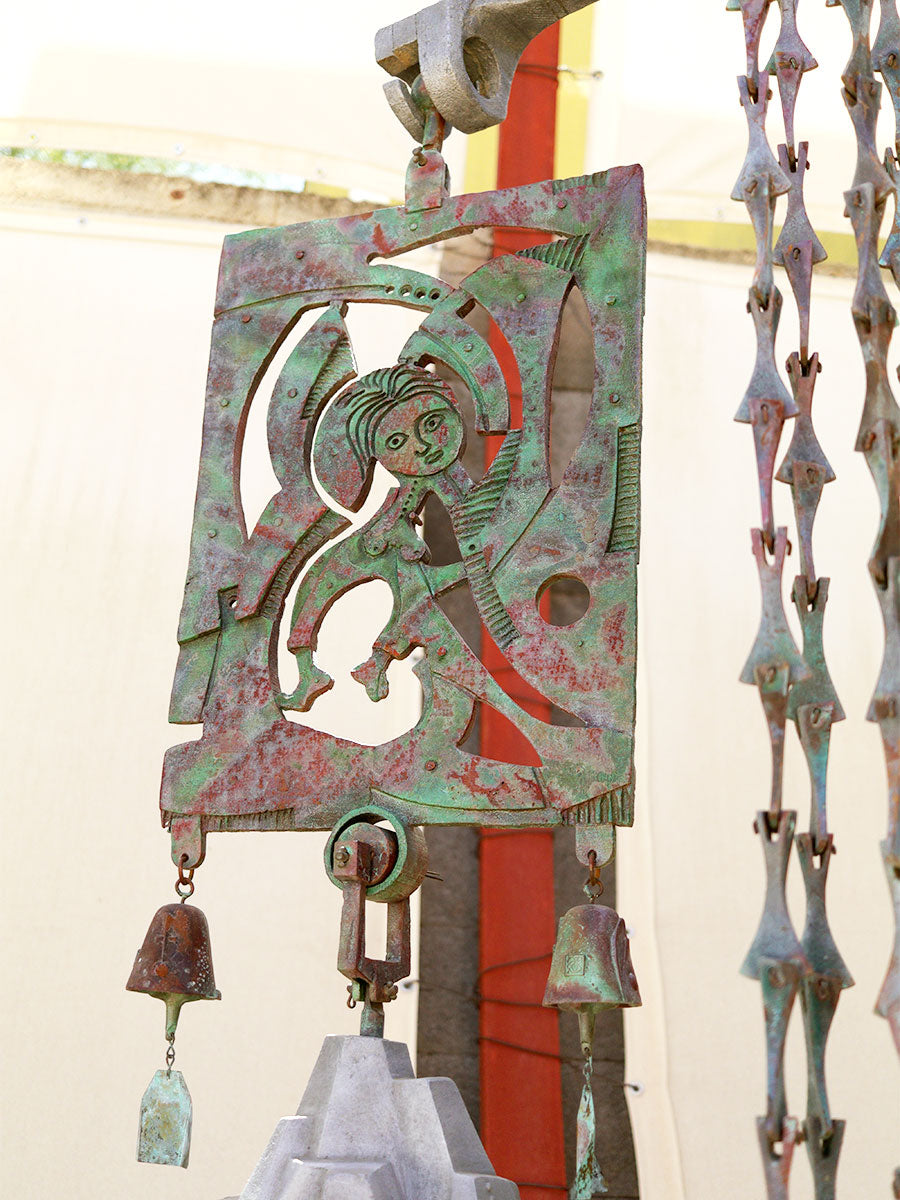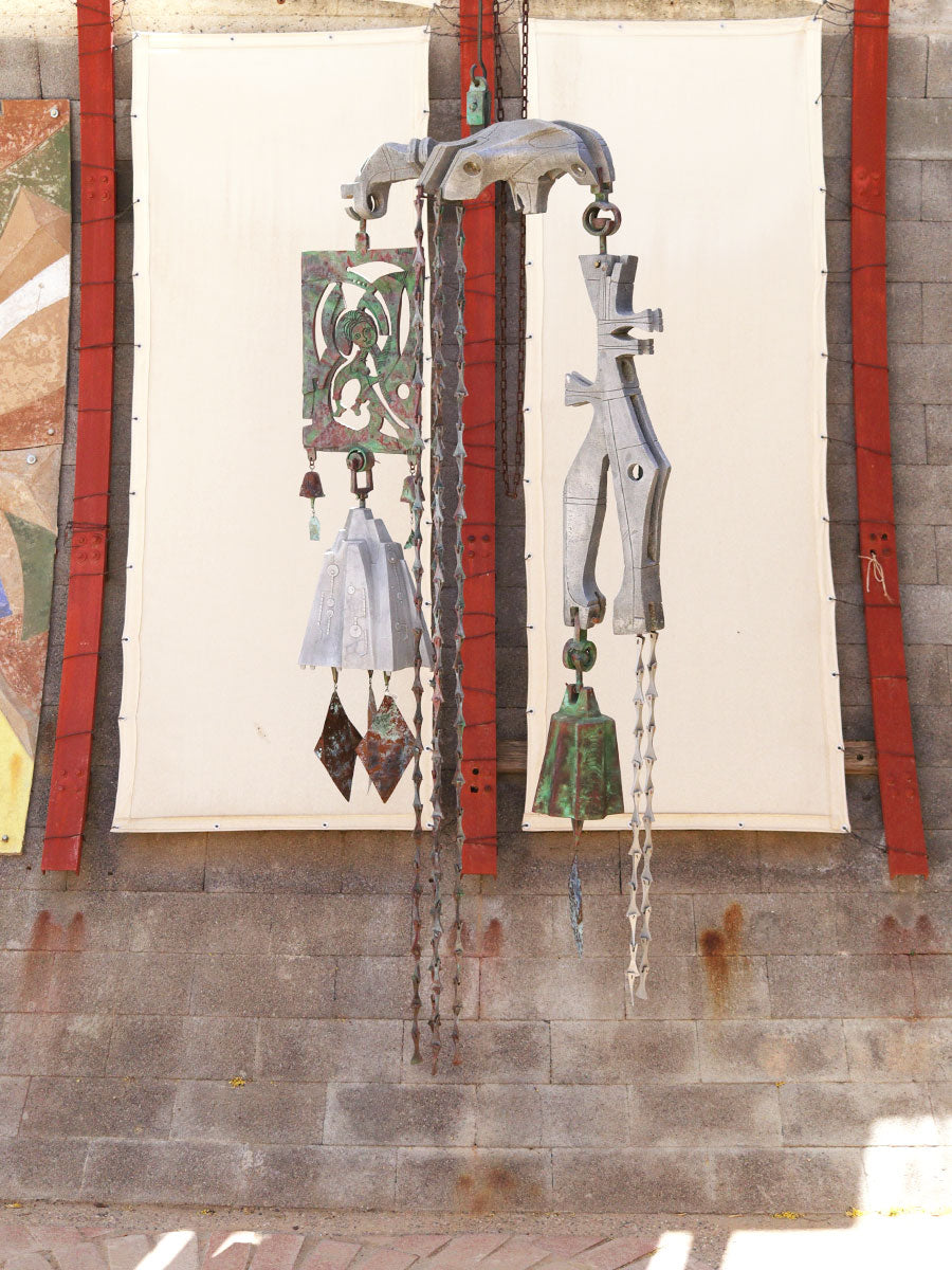 This assembly was completed by the foundry artisans at Cosanti in 2023 | Composition and assembly by Corey Rosen, #121 Bronze Bell by Jeff Hildebrandt, #122 Aluminum Bell by Andy Chao, #135 Bronze Bells by Sue Lawrence.